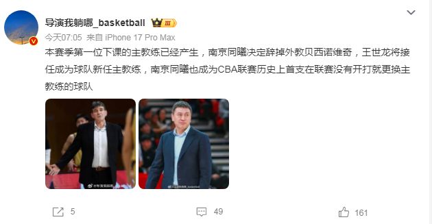 北京时间12月9日,2025-26赛季的CBA新赛季尚未开始,如今根据国内媒体与媒体人报道,因为在CBA俱乐部杯表现不佳与难以有效调整,同曦男篮洋帅贝西洛维奇将被辞掉,前浙江男篮获得过最佳主教练奖的王世龙将接任成为主教练,同曦男篮成为CBA历史首支在新赛季尚未开始就换帅的球队。