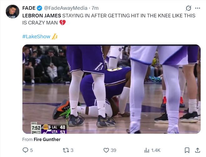 詹姆斯痛苦倒地,他在地板上尝试膝盖的感觉,随后詹姆斯起身后继续鏖战,美记写道:詹姆斯的膝盖遭遇了如此冲撞还能留在场上,这太疯狂了,为他心碎。